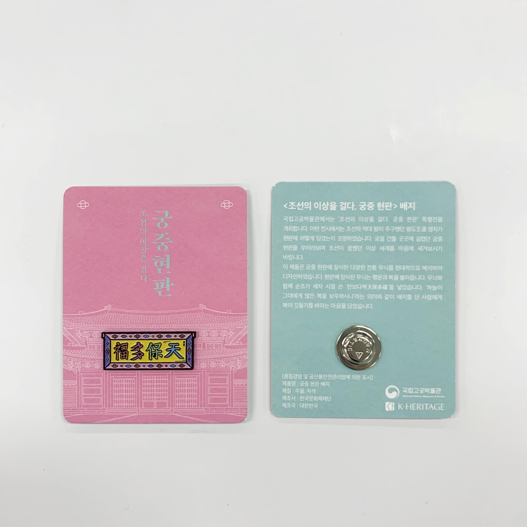 조선 순조가 세자 시절에 쓴 '천보다복'(天保多福) 현판과 숙종 글씨를 새긴 '교월여촉'(皎月如燭) 현판을 활용해 상품을 만들었다. 상품은 휴대전화 끈, 고리 장신구, 명찰 목걸이, 배지 등 4종이다.