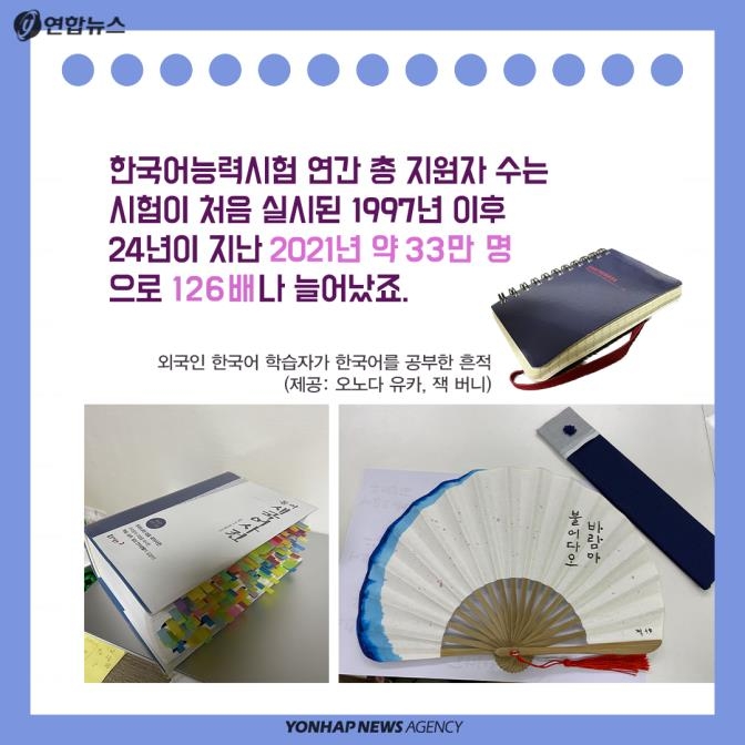 한국어능력시험 연간 총지원자 수는 시험이 처음 실시된 1997년 이후 24년이 지난 2021년 약 33만 명으로 126배나 늘어났죠.