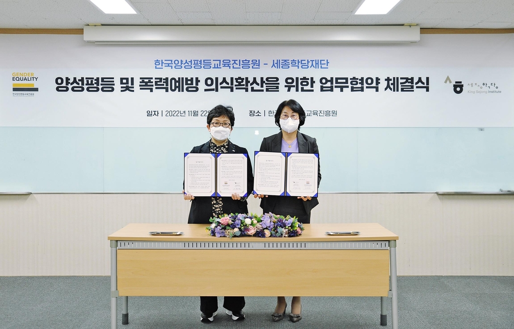 협약에 따라 양 기관은 전 세계 세종학당 내 양성평등 인식 제고 교육, 한국어·한국문화 교육 콘텐츠의 성 인지 감수성 제고, 양성평등 및 폭력 예방 조직문화 확산 등에 협력하기로 했다.