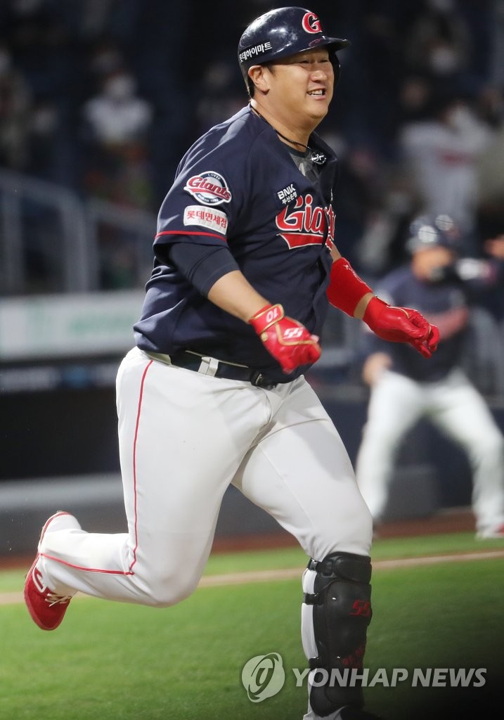 | ▲ In this file photo from Oct. 16, 2020, Lee Dae-ho of the Lotte Giants heads to first base after hitting a single against the NC Dinos in the top of the eighth inning of a Korea Baseball Organization regular season game at Changwon NC Park in Changwon, 400 kilometers southeast of Seoul. (Yonhap) |