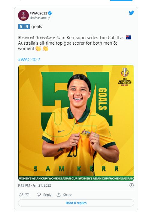 | ▲ 호주 선수 A매치 최다골 신기록을 세운 샘 커. [AFC 여자 아시안컵 조직위원회 트위터. 재판매 및 DB 금지] |