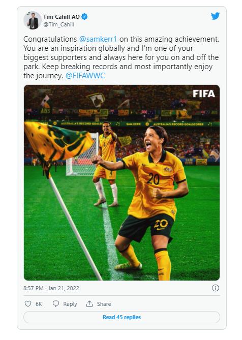 케이힐은 자신의 사회관계망서비스(SNS)를 통해 "너는 전 세계적으로 영감을 주는 선수다. 나는 그라운드 안팎에서 늘 너를 응원하는 열렬한 팬이다"라면서 "계속 기록을 깨나가라. 그리고 무엇보다 중요한 것은 그 여정을 즐기는 것"이라고 덕담을 건넸다.