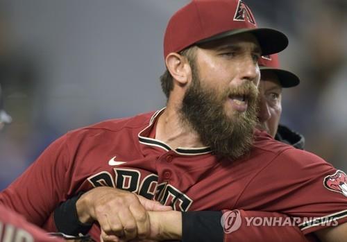 (서울=연합뉴스) 임순현 기자 = 미국프로야구 메이저리그(MLB) 애리조나 다이아몬드백스 좌완 선발 매디슨 범가너가 이물질 검사를 하는 심판에게 욕설을 해 퇴장을 당했다.