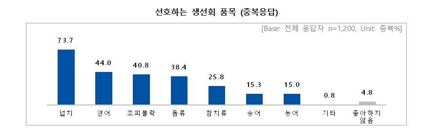 생선회 선호도 조사에서는 넙치(광어)가 가장 인기가 많은 것으로 나타났다. 이어 연어, 조피볼락(우럭), 돔류 순이었다.