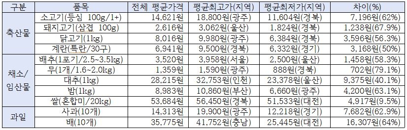 | ▲ 설 성수품의 지역별 평균가격 최고·최저치 [소비자공익네트워크 제공. 재판매 및 DB 금지] |