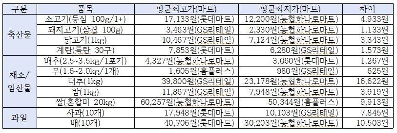 마트별로 평균가격이 가장 낮은 품목은 ▲ 롯데마트 돼지고기·배추 ▲ 홈플러스 쌀 ▲ 농협하나로마트 소고기 등심·닭고기·대추·밤·배 ▲ GS리테일 계란·무·사과 등이었다.