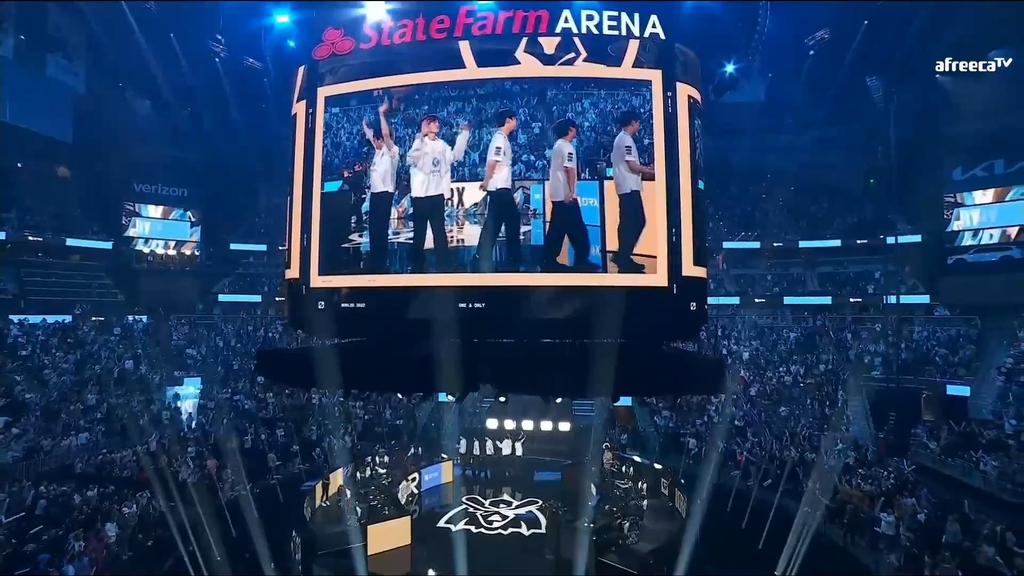 | ▲ 결승 진출 확정 후 팬들에게 인사하는 DRX 선수들 [LoL 월드 챔피언십 공식 중계 영상 캡처] |