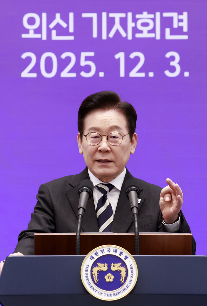 President Lee Jae Myung attends a press conference with foreign media at the former presidential office, Cheong Wa Dae, in Seoul on Dec. 3, 2025, to mark the one-year anniversary of the Dec. 3 martial law crisis. (Pool photo) (Yonhap)