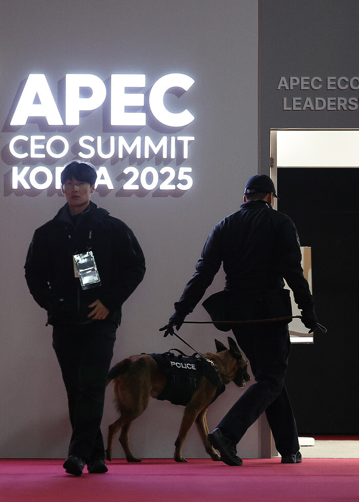 Police commandos stand guard at the venue of the CEO Summit of the Asia-Pacific Economic Cooperation forum in Gyeongju, North Gyeongsang Province, southeastern South Korea, on Oct. 28, 2025, the opening day for the summit set for Oct. 29-31 in the run-up to the APEC summit on Oct. 31-Nov. 1 in the city. (Yonhap)