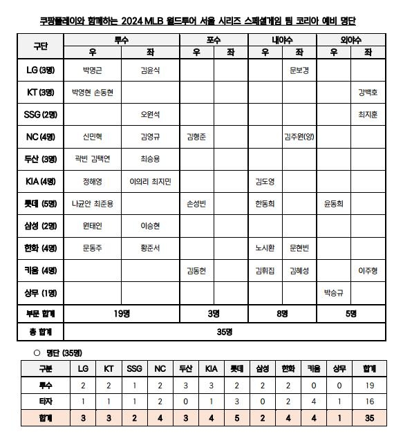 예비 명단 35명은 투수 19명과 포수 3명, 내야수 8명, 외야수 5명으로 구성했다.