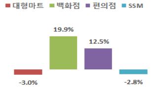 오프라인 유통업체의 경우 백화점 매출이 지난해 동월보다 19.9% 늘었고 편의점은 12.5% 증가했다. 반면 대형마트는 3.0% 줄었고 기업형 슈퍼마켓(SSM)도 2.8% 감소했다.
