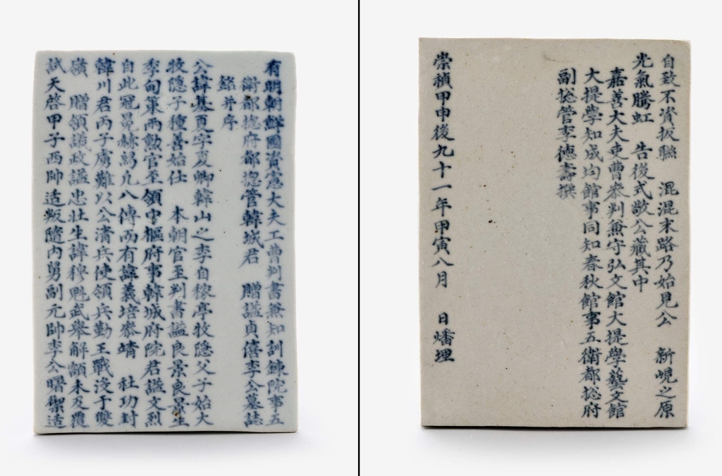 이어 "18세기 조선 상층부를 중심으로 제작된 백자 묘지의 전형적 사례"라며 "색조가 안정된 청화 안료를 사용한 묘지는 관요(官窯·관아가 운영한 가마)였던 분원(分院)에서 생산된 것으로 추정된다"고 덧붙였다.
