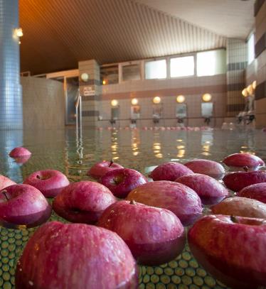 | ▲ 아오모리현의 한 온천물에 떠 있는 아오모리산 사과 [일본자치체국제화협회 홈페이지] |