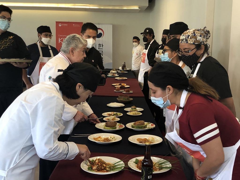 | ▲ 멕시코 요리사들이 만든 김치 요리 심사 (멕시코시티=연합뉴스) 고미혜 특파원 = 주멕시코 한국문화원이 28일(현지시간) 멕시코시티에서 연 김치 대축제에서 심사위원들이 참가자들의 요리를 맛보고 있다. 2021.11.29. mihye@yna.co.kr |