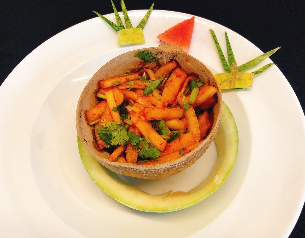 | ▲ 멕시코 한인후손이 만든 수박 껍질 김치 (멕시코시티=연합뉴스) 고미혜 특파원 = 주멕시코 한국문화원이 28일(현지시간) 멕시코시티에서 연 김치 대축제에서 한인 후손 참가자 예스비 리가 만든 수박껍질 김치. 2021.11.29. mihye@yna.co.kr |