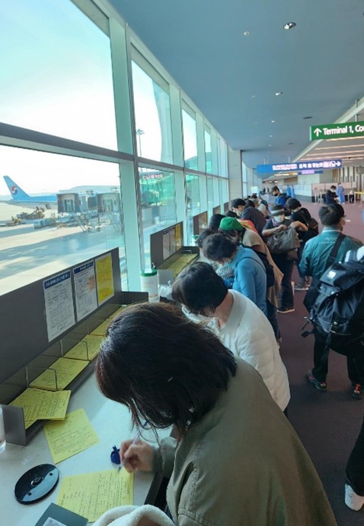 | ▲ 승객들이 입국 시 일제히 몰려 건강상태 질문서를 작성하고 있다. [사진/성연재 기자] |