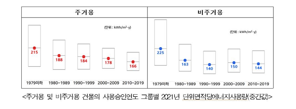 단열기준 도입 시점인 1979년 이전 사용승인을 받은 건축물은 최근 10년 이내(2010~2019)에 사용승인을 받은 주거용 건물에 비해 단위면적당 에너지 사용량이 23% 많은 것으로 조사됐다. 같은 조건에서 비주거용 건물은 에너지 사용량이 36% 많았다.