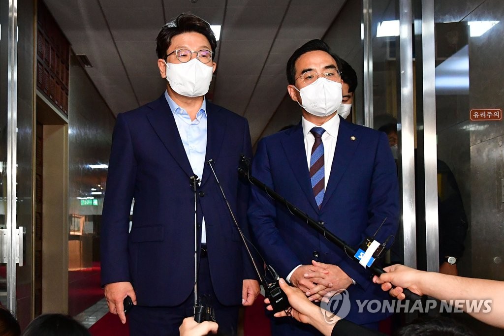 | ▲ Rep. Kweon Seong-dong (L), acting chair and floor leader of the People Power Party, and Rep. Park Hong-keun, floor leader of the Democratic Party, talk to reporters after a meeting at the National Assembly on July 21, 2022. (Pool photo) (Yonhap) |