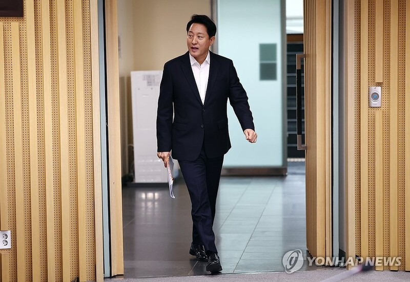 | ▲ 간담회장 들어서는 오세훈 시장 (서울=연합뉴스) 윤동진 기자 = 오세훈 서울시장이 17일 서울시청에서 열린 신년 기자간담회에 참석하고 있다. 2024.1.17 mon@yna.co.kr |