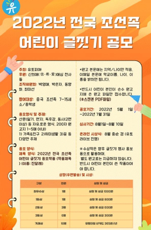 한편 조선족 육아 커뮤니티인 유토피아는 중국 및 한국 거주 조선족 초등·중등 학생을 대상으로 '조선족 어린이 글짓기'를 공모한다.