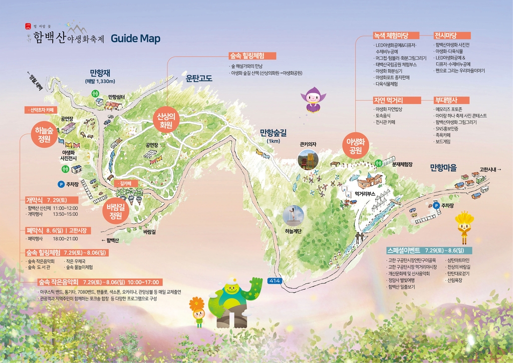 올해는 '만항재, 구름 위의 정원을 걷다'를 주제로 숲속 작은 음악회, 숲 해설, 숲속도서관, 숲속 물놀이, 자연 먹거리, 녹색 체험 마당 등으로 진행한다.