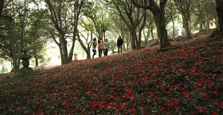 봄이 되면 7m 높이의 동백나무들이 일제히 동백꽃을 피워내는 눈부신 장관을 연출한다.