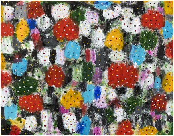 1990년대말∼2000년대 초반 시기 작품으로는 수레바퀴가 떠오르는 검은 도형 위에 붉은색 물감으로 손바닥을 돌아가며 찍어낸 '무제'(1998), 빨강과 짙은 녹색, 노랑과 파랑 등 강렬한 색채 대비가 인상적인 가로 3.3m, 세로 2.6m 작품 '무제'(2003) 등을 볼 수 있다.