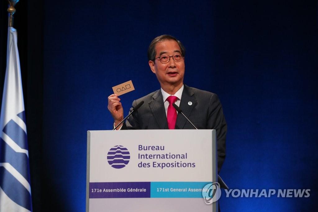 | ▲ South Korean Prime Minister Han Duck-soo gives a presentation on the country's bid to host the 2030 World Expo in the South Korean port city of Busan during a general assembly of the Bureau of International Expositions in Paris on Nov. 29, 2022, in this photo released by the Prime Minister's Office. (PHOTO NOT FOR SALE) (Yonhap) |