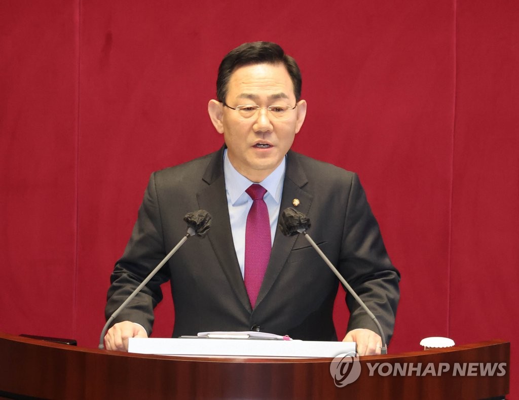 | ▲ Rep. Joo Ho-young, the floor leader of the ruling People Power Party, delivers a speech at the National Assembly in western Seoul on Feb. 14, 2023. (Yonhap) |
