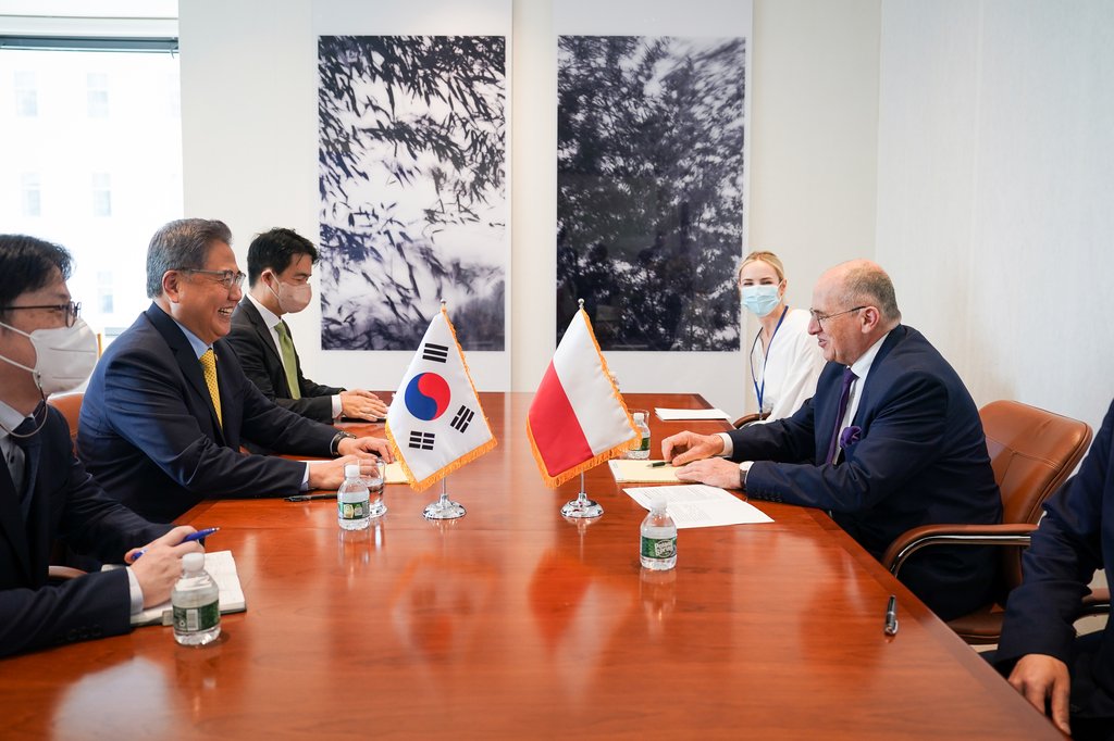| ▲ South Korean Foreign Minister Park Jin (2nd from L) holds talks with his Polish counterpart, Zbigniew Rau (R), as they meet on the margins of the U.N. General Assembly in New York on Sept. 19, 2022, in this photo released by Park's office. (PHOTO NOT FOR SALE) (Yonhap) |