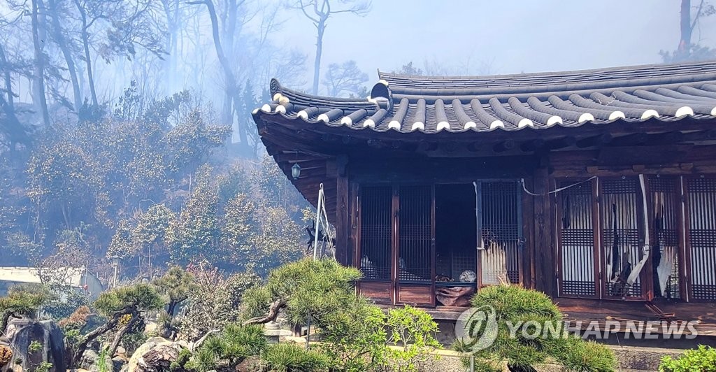 | ▲ 강릉 산불…문화재 피해 (강릉=연합뉴스) 유형재 기자 = 11일 오전 강원 강릉시 난곡동의 한 야산에서 난 불이 확산 중인 가운데 도 유형문화재 50호 방해정에도 피해가 발생했다. 2023.4.11 yoo21@yna.co.kr |