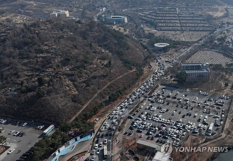 | ▲ 설 연휴 앞둔 묘지 입구는? (인천=연합뉴스) 류영석 기자 = 설 연휴를 앞둔 4일 오전 주말을 맞아 인천가족공원 입구가 성묘객들 차량으로 붐비고 있다. 2024.2.4 ondol@yna.co.kr |