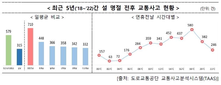 5일 도로교통공단과 소방청이 최근 5년간 설 명절 전후로 발생한 교통사고를 분석한 결과에 따르면 연휴 시작 전날 평소(579건)보다 약 1.2배 많은 710건의 사고가 발생했다. 시간대는 어두워지기 시작하는 오후 6시께가 가장 많았다.
