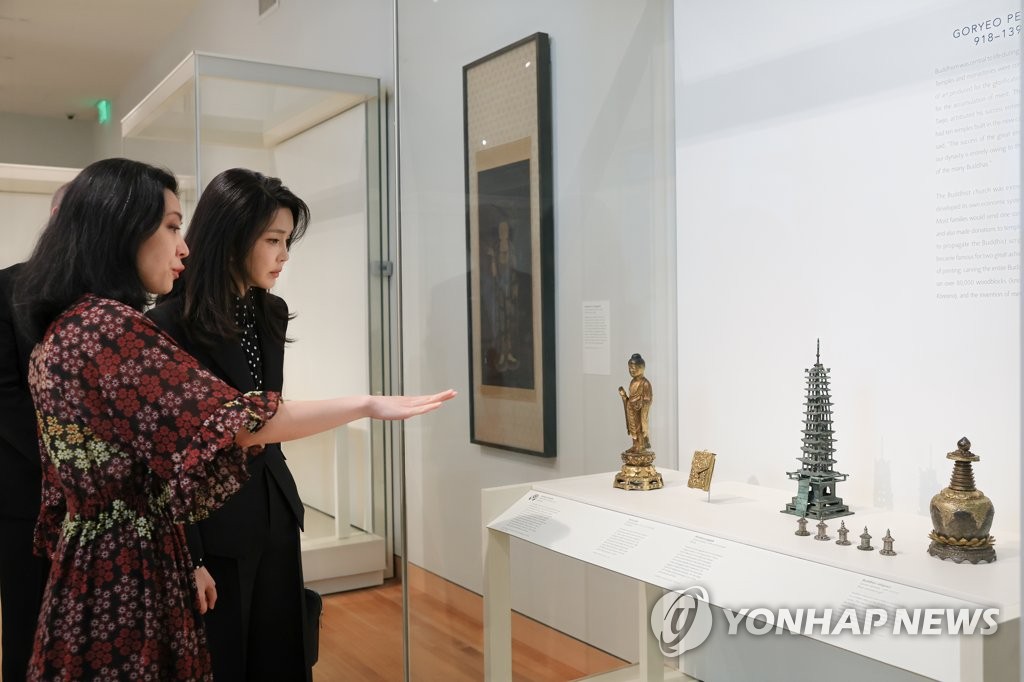 | ▲ 은제도금 라마탑형 사리구 살펴보는 김건희 여사 (보스턴=연합뉴스) 임헌정 기자 = 윤석열 대통령과 미국을 국빈 방문 중인 김건희 여사가 28일(현지시간) 보스턴 미술관을 방문, 미술관이 소장한 '은제도금 라마탑형 사리구'와 사리를 살펴보고 있다. 2023.4.29 [공동취재] kane@yna.co.kr |