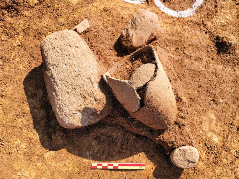 | ▲ 신안리에서 발굴된 갈돌과 빗살무늬토기 [김포시 제공. 재판매 및 DB 금지] |