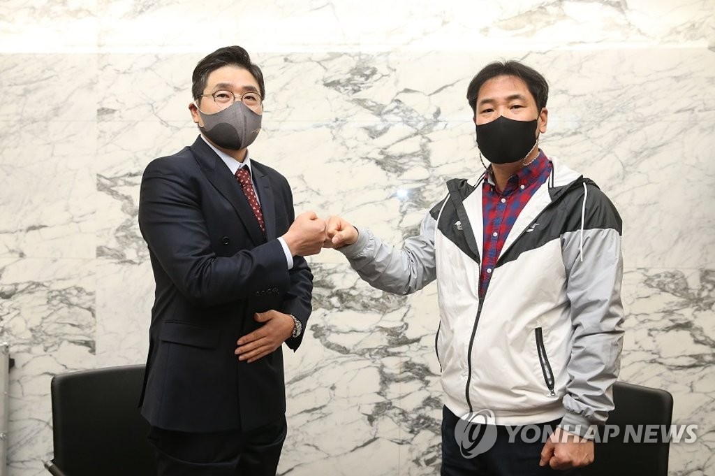 | ▲ This photo provided by the Kiwoom Heroes on Jan. 21, 2021, shows the Korea Baseball Organization club's new manager, Hong Won-ki (L), and new general manager, Ko Hyung-wook. (PHOTO NOT FOR SALE) (Yonhap) |