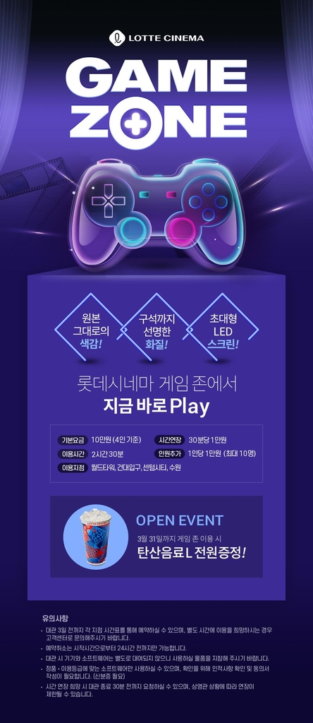 (서울=연합뉴스) 강애란 기자 = ▲ 롯데시네마가 영화관의 대형 LED 스크린을 통해 콘솔게임을 즐길 수 있도록 상영관을 대관해 주는 '게임존'을 오픈한다.
