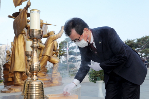 이시종 도지사, 행정·경제부지사, 실국원장 등 소수 인원만 참석한 가운데 항일독립운동기념탑과 5인 동상 앞에서 헌화와 묵념 등을 진행했다.