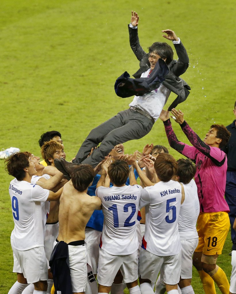 | ▲ 동메달결정전에서 승리한 뒤 선수들이 홍명보 감독을 헹가래 치는 장면 [연합뉴스] |