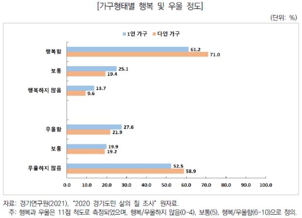 행복도 조사(지난 1주일 행복했다는 응답 61.2%))에서도 다인 가구(71.0%)보다 낮은 것으로 나타났다.