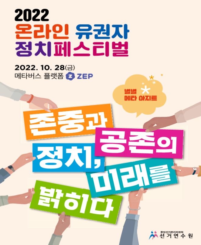 ▲ 중앙선거관리위원회 선거연수원은 유권자 정책 소통 행사인 '2022 유권자정치페스티벌'을 이달 28일 메타버스 플랫폼 '젭'(ZEP)을 통해 개최한다고 24일 밝혔다. '존중과 공존의 정치, 미래를 밝히다'라는 주제로 열리는 이번 행사에서는 헌법·정당학회 및 유권자 단체의 강연, 토크콘서트 등 프로그램이 진행될 예정이다. (서울=연합뉴스)