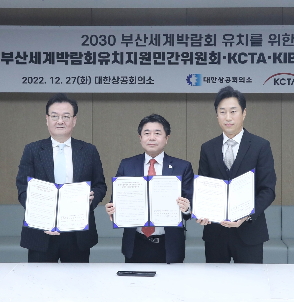 (서울=연합뉴스) 김아람 기자 = 대한상공회의소는 27일 서울 상의회관에서 한국케이블TV방송협회(KCTA), 한국IPTV방송협회(KIBA)와 2030부산세계박람회(엑스포) 유치 홍보를 위한 업무협약(MOU)을 맺었다.