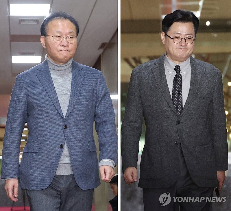 | ▲ This combined photo shows Rep. Yun Jae-ok (L), floor leader of the ruling People Power Party, and Rep. Hong Ik-pyo, floor leader of the main opposition Democratic Party, before their meeting in Seoul on Jan. 24, 2024. (Yonhap) |