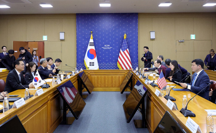 Jeong Yeon-doo (L), vice minister for diplomatic strategy and intelligence at the foreign ministry, holds talks with acting U.S. Ambassador to South Korea Kevin Kim (R) at the foreign ministry in Seoul on Dec. 16, 2025, to coordinate their North Korea policy. (Pool photo) (Yonhap)