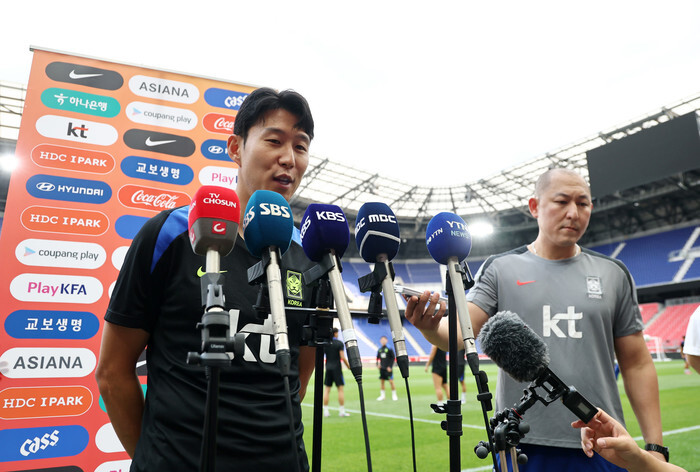 Son Heung-min, longtime captain of the South Korean men's national football team, speaks to reporters at Sports Illustrated Stadium in Harrison, New Jersey, on Sept. 5, 2025. (Yonhap)