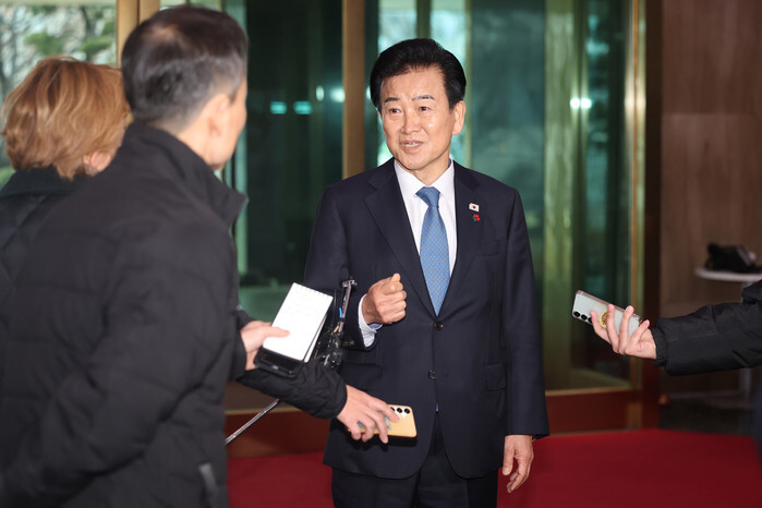 Unification Minister Chung Dong-young answers questions from reporters before entering his office at the Seoul Government Complex in the capital on Dec. 11, 2025. He denied bribery allegations involving the Unification Church. (Yonhap)