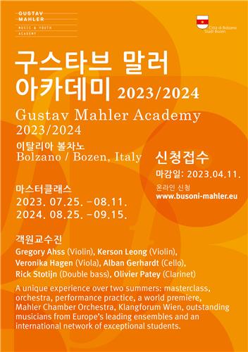 페루초 부소니-부소니 말러재단은 올해 7월 25일∼8월 11일과 내년 8월 25일∼9월 15일에 걸쳐 진행되는 제24회 구스타브 말러 아카데미의 참가자를 다음 달 11일까지 모집한다고 14일 밝혔다.
