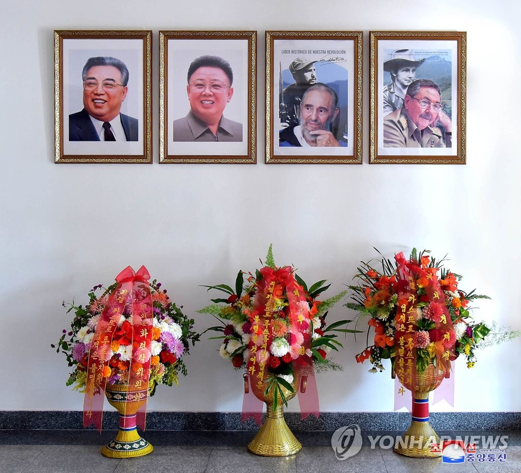 | ▲ This file photo, carried by North Korea's official Korean Central News Agency on Aug. 15, 2023, shows the photos hung at the Cuban Embassy in Pyongyang of North Korea's late founder Kim Il-sung (L), late leader Kim Jong-il (2nd from L) and late Cuban President Fidel Castro and his brother Raul Castro. (For Use Only in the Republic of Korea. No Redistribution) (Yonhap) |