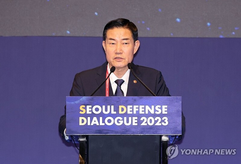 | ▲ Defense Minister Shin Won-sik delivers an opening speech during the Seoul Defense Dialogue held in Seoul on Oct. 18, 2023. (Yonhap) |