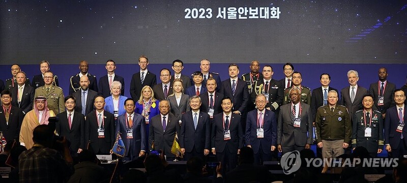 | ▲ Participants of the 2023 Seoul Defense Dialogue pose for a photo during the forum held at Grand Inter Continental Seoul in the capital on Oct. 18, 2023. (Yonhap) |
